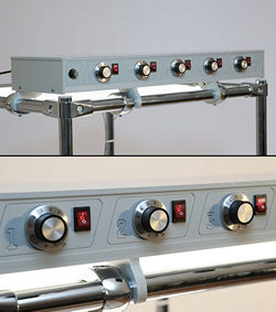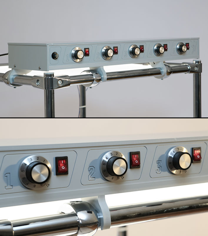 Основание стеллажа выполнено из стальных хромированных труб диаметром 25 мм и креплений из хромированного алюминиевого сплава. Полки изготовлены из специального светорассеивающего пластика. Каждая полка снабжена отдельным блоком питания с регулятором, что повышает надежность конструкции.